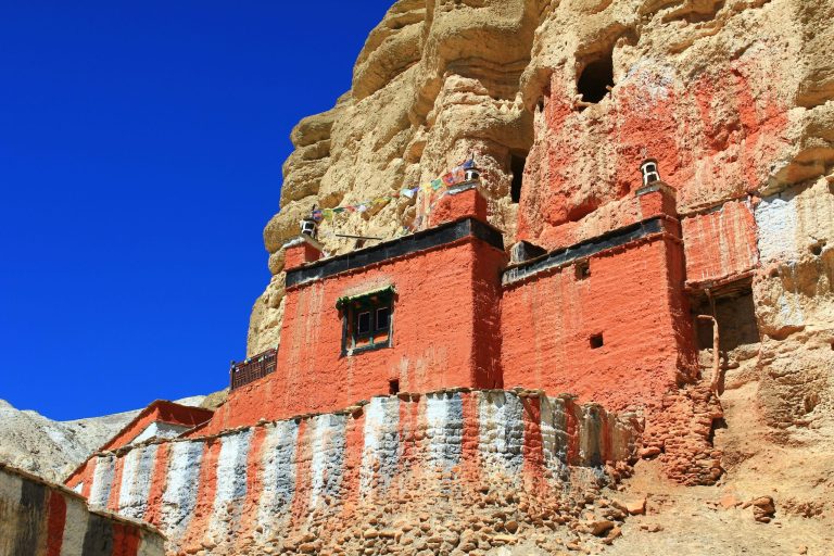 Départ de Lo Manthang pour Tsarang, en passant devant plusieurs chortens très anciens. Continuation pour Tsarang au milieu de champs d’orge, de moutarde et de sarrasin. Nous découvrons le monastère construit au flanc de la montagne ; il comporte de magnifiques peintures sur les murs à l’intérieur.